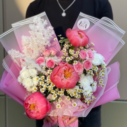 Авторский букет с пионами,кустовыми ромашками и розами