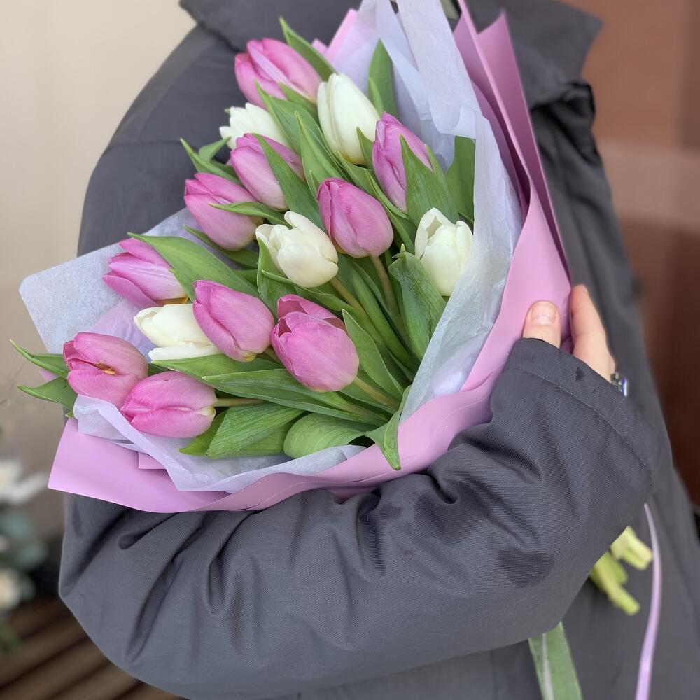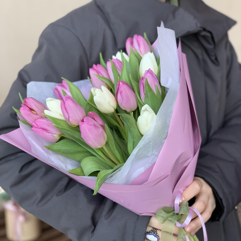Белые и сиреневые тюльпаны 15 шт / 1296 id