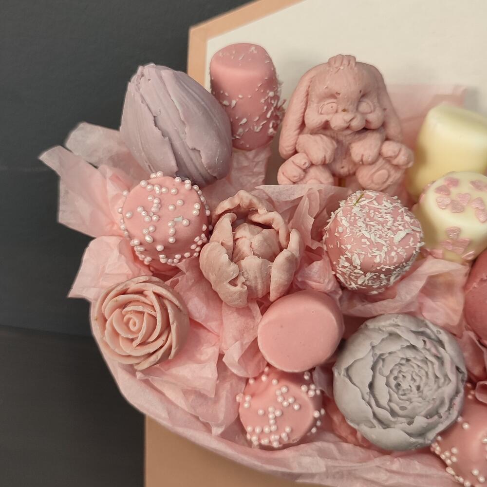 пион из белого бельгийского шоколада – 2 шт.тюльпан из бельгийского шоколада – 2 шт.маршмеллоу в шоколаде – 15 шт.конверт картонный – 1 шт.